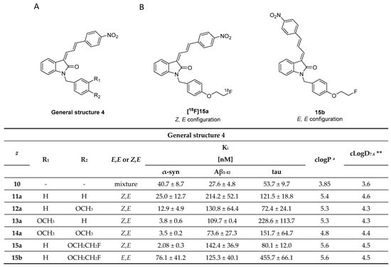 Chemical structures of indolidone-diene analogues with key properties. (A) General structure of indolidone-dienes and their binding affinity toward recombinant α-syn, tau, and synthetic Aβ1–42 fibrils determined by ThT competitive binding assays [105]. a clogP were calculated from BioByte software. ** clogD7.4 values calculated by ACD/Percepta. (B) Chemical structures of [18F]15a (Z,E configuration) and 15b (E,E configuration) [105].
