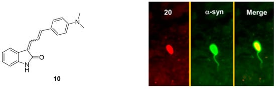 Chemical structure of 10 and fluorescent microscopy studies on brain tissue from PD/DLB and PD patients (reprinted with permission from [105] Copyright 2015 American Chemical Society).