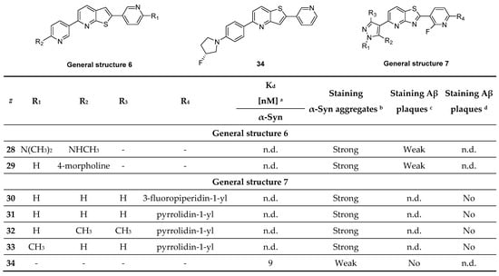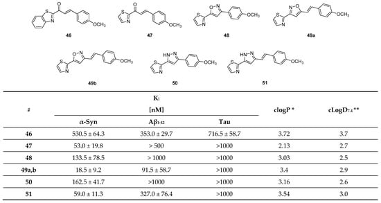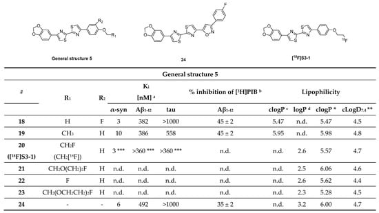 Several diphenylthiazole, diphenyloxazoles and diphenylthiophenes compounds were developed as potential α-syn imaging agents [106]. However, only one diphenylthiazole, compound 17 (Figure 13) has thus far shown a reasonable affinity (Ki = 89 nM) toward α-syn aggregates in affinity measurements conducted using a competition binding assay. Compound 17 also did not show any significant binding for Aβ in AD tissue.