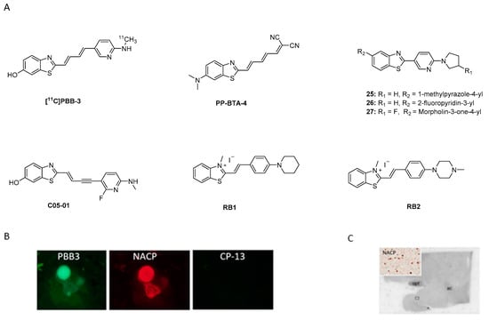 TMA is an effective approach for high-throughput molecular analysis of pathological tissues, as it makes use of paraffin blocks, which allow one to measure several tissue cores without consuming the tissue block. A further advantage of TMA is that it can be used to examine tissue from multiple patients. TMA also allows multiplexing of histological analysis including immunohistochemistry, immunofluorescence, histological staining. The binding profile of C05-01 was determined on recombinant α-syn fibrils using saturation and competition binding assay with [3H]C05-01 and C05-01 and an affinity in the range 25–30 nM was determined. Further studies using brain homogenates from DLB (amygdala) revealed different affinities to those previously reported by Koga et al. [111]. [11C]PBB3 showed a moderate affinity (Kd of 58 nM) while non-labeled C05-01 demonstrated a high affinity (Ki of 3.5 nM). These data once again showed that the tertiary structure of fibrils and brain homogenates can be different. Another reason for the observed discrepancy may be the variance of experiments. Further characterization of selectivity using PD, MSA, AD and Pick’s disease TMA sections and fresh frozen tissue confirmed the binding of C05-01 to α-syn, however, binding to other amyloids was also shown [114]. Recently, new ThT analogues, namely RB1 and RB2 (Figure 15A), were developed in order to achieve stronger selectivity for α-syn over amyloid fibrils. Key structural features include introduction of a double bond and cyclic nitrogen donors (either piperidine or piperazine). Binding affinities were tested using α-syn fibrils (concentration < 30 µM) and revealed Kd values of 30 nM and ~4.4 µM for RB1 and RB2, respectively. The authors hypothesize that the piperidine moiety fits better in the hydrophobic pocket of α-syn fibrils and therefore RB1 shows higher affinity for α-syn than the lead compound. No selectivity data over Aβ or tau have been reported. Encouraged by these results the authors studied RB1 and its applicability for live-cell imaging using the SH-SY5Y human neuroblastoma cell line. Cultured cells were incubated with short α-syn fibrils. Then, these cells were incubated with RB1 at concentration 500 nM and demonstrated selective staining of α-syn fibrils in the cytosol. This study showed an approach to implement the design and development of new compounds. However, binding affinity and selectivity profile need to be further improved and investigated [115].