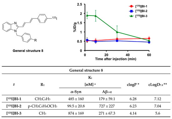 - Watanabe, H.; Ariyoshi, T.; Ozaki, A.; Ihara, M.; Ono, M.; Saji, H. Synthesis and biological evaluation of novel radioiodinated benzimidazole derivatives for imaging α-synuclein aggregates. Bioorg. Med. Chem. 2017, 25, 6398–6403. [Google Scholar] [CrossRef]