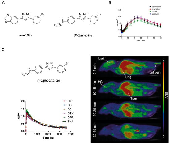 - Maurer, A.; Leonov, A.; Ryazanov, S.; Herfert, K.; Kuebler, L.; Buss, S.; Schmidt, F.; Weckbecker, D.; Linder, R.; Bender, D.; et al. 11C Radiolabeling of anle253b: A Putative PET Tracer for Parkinson’s Disease That Binds to α-Synuclein Fibrils in vitro and Crosses the Blood-Brain Barrier. ChemMedChem 2020, 15, 411–415. [Google Scholar] [CrossRef] [PubMed] [Green Version]