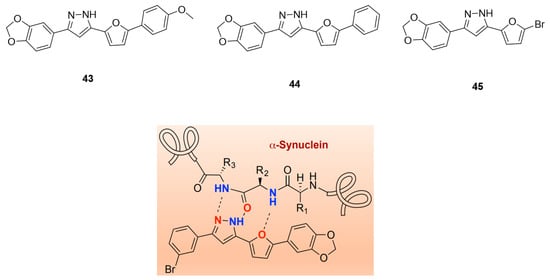 - Ryan, P.; Xu, M.; Jahan, K.; Davey, A.K.; Bharatam, P.V.; Anoopkumar-Dukie, S.; Kassiou, M.; Mellick, G.D.; Rudrawar, S. Novel Furan-2-yl-1H-pyrazoles Possess Inhibitory Activity against α-Synuclein Aggregation. ACS Chem. Neurosci. 2020, 11, 2303–2315. [Google Scholar] [CrossRef]