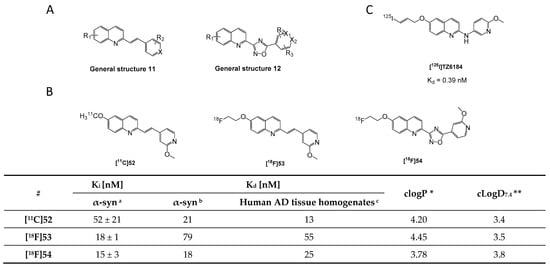 In parallel to the phenothiazines, their isosteres, the phenoxazines and the phenazines, were also evaluated as potential α-syn PET tracers. Tu et al. synthesized a small compound library consisting of 8 compounds and determined their binding affinity toward recombinant α-syn fibrils by a ThT-based fluorescence assay. Several ligands showed affinity in the nanomolar range (Figure 8A) and among them TZ-2-39 with the lowest Ki value of 9.5 nM [97]. In comparison with the phenothiazines, the phenoxazines showed better affinity toward α-syn fibrils. For example, SIL5 showed a Ki of 32.1 nM while TZ-2-33 a Ki of 25.7 nM. Values were determined using the same binding assay set-up. No further attempts have been made thus far to improve the binding profile of this structural class. TZ-2-48 showed displaceable binding and was shown to bind preferentially to the BS 3/13 position of α-syn fibrils [43]. Interestingly, the phenazines (Figure 8B) did not show any significant affinity toward α-syn, highlighting the importance of oxygen or sulfur in the bridge between the aromatic rings [97].