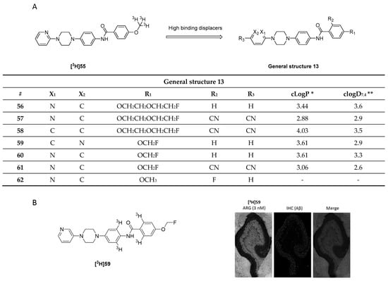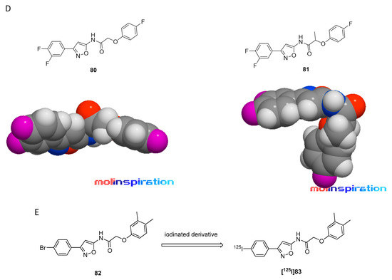 In 2018, Verdurand et al. applied a rational drug design approach to two other lead structure scaffolds (benzoimidazoles and TCAs) based on benzoxazoles. Computational modeling was applied, and various combinations of lead structure motifs were docked into an α-syn fibril model [67]. Among the 10 virtually designed compounds, two ligands (2FBox and 4FBox) were considered worthwhile to be synthesized and in vitro tested. 18F-Radiolabeling of these molecules succeeded with a RCY of 10–19% and an Am = 68–543 GBq/µmol. Affinity and selectivity were determined with an in vitro saturation assay using synthetic α-syn and Aβ1–42 fibrils. [18F]2FBox (Figure 10B) showed the best binding characteristics with an affinity of Kd = 3.3 ± 2.8 nM against α-syn fibrils and a roughly 50-fold selectivity over Aβ1–42 fibrils. In vitro ARG of rat brains showed that [18F]2FBox was able to detect α-syn fibrils previously injected. Interestingly, preclinical imaging using the same animal model showed that [18F]2FBox was not able to image these α-syn fibrils in vivo, although [18F]2FBox showed sufficient brain uptake and an acceptable, but slow clearance profile. Peak brain uptake was 0.47% ID/g at 12 min p.i. (SUV = 1.6), and the tracer was washed out slowly, lowering its peak uptake only 20% within 50 min. The authors suggested that the discrepancy between the in vitro to in vivo results might be due to the low spatial resolution of PET imaging in comparison to in vitro ARG. The high non-displaceable binding component of [18F]2FBox could also possibly prevent selective imaging. However, [18F]2FBox also failed to detect selective binding on postmortem brain tissue (medulla oblongata) from PD and MSA patients using ARG [67].