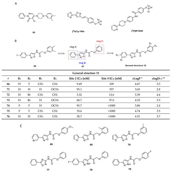 A series of BF-277-like compounds were designed in order to increase the affinity and selectivity profile of BF-227 (Figure 10A) toward α-syn. Various oxyethylene groups (5–7) as well as hydrogen, iodine (8) and fluorine (9) were introduced to study the substitution pattern of the 6-position of the benzo[d]oxazole. Introduction of these oxyethylene groups did not alter the affinity or the selectivity profile of the compound at all. Substitution of the fluoroethoxy group with an iodine increased the selectivity approximately 10-fold, whereas substitution with fluorine or hydrogen lowered the affinity toward α-syn fibrils from 53 nM to 286 nM (Figure 10) [103]. Interestingly, this research suggested that the binding affinity of BF-227 toward α-syn fibrils was significantly different when compared to the affinity initially reported by Fodero-Tavoletti et al. [99] (Figure 10). A possible explanation for this discrepancy may be that different in vitro assays as well as different fibril preparations were used in these studies.
