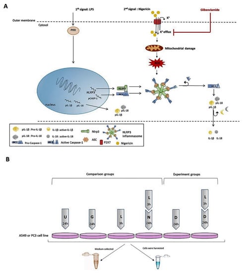 - Lamkanfi, M.; Mueller, J.L.; Vitari, A.C.; Misaghi, S.; Fedorova, A.; Deshayes, K.; Lee, W.P.; Hoffman, H.M.; Dixit, V.M. Glyburide inhibits the Cryopyrin/Nalp3 inflammasome. J. Cell Biol. 2009, 187, 61–70. [Google Scholar] [CrossRef] [PubMed]
