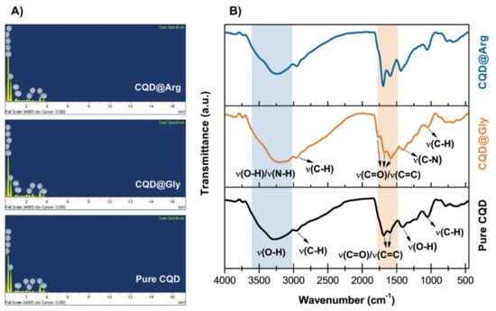 From a chemical aspect, pure CQD were prepared as a reference system consisting mainly of carbon (61.89%) and oxygen (34.74%), as demonstrated by EDS analysis (Figure 1A, Table S2), while nitrogen was not detected in the sample. The addition of amino acids Gly and Arg resulted in nitrogen incorporation in the prepared CQDs, as shown in Table S2, Figure 1A, and Figure S2.