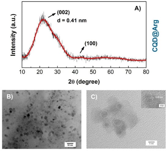 The average particle size and morphological characteristics of the CQD@Arg sample were determined by the transmission electron microscopy (TEM) and high-resolution TEM (HR-TEM) analysis. As it can be seen from Figure 2B, TEM images show nearly spherical morphology of synthesized CQD@Arg particles with an average diameter of (8.52 ± 1.72) nm and the existence of aggregates giving particles of diameter ≥10 nm. The HR-TEM (Figure 2C) images show lattice spacing of d = 0.31 nm.