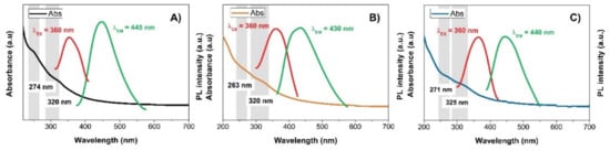 UV-vis absorption spectrum with maximum fluorescence excitation and emission spectrum of (A) Pure CQD, (B) CQD@Gly, and (C) CQD@Arg.