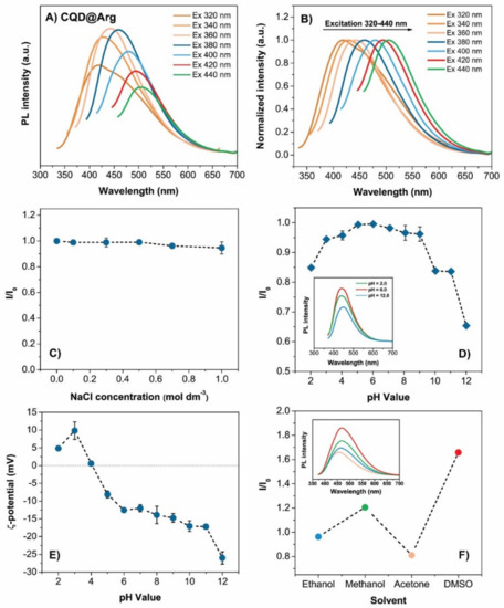 Optical characterization of CQD@Arg: (A) Fluorescence emission spectra of CQD@Arg at different excitation wavelengths ranging from 320 nm to 440 nm (increments of 20 nm); (B) normalized fluorescence emission intensity, (C) stability of CQD@Arg in the high ionic medium of NaCl (0–1.0 mol dm−3; λEx = 360 nm); (D) fluorescence intensity vs. pH variation (λEx = 360 nm); (E) variations of ζ-potential as a function of pH; (F) fluorescence spectra of CQD@Arg in ethanol, methanol, acetone, and DMSO (λEx = 360 nm).