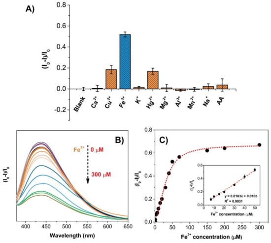 In order to evaluate selectivity and interference effects in ion sensing and detection using CQD@Arg, different ions were tested, including Ca2+, Cu2+, Fe3+, K+, Hg2+, Mg2+, Al3+, Mn2+, Na+, as well as sensitivity on the ascorbic acid (AA). For this purpose, the concentration of CQD@Arg was adjusted to 25 µg/mL, and the concentration of different chemical species was prepared to 100 µM. The results indicated high sensitivity and selectivity toward Fe3+ ions detection, and the coexistence of other tested ions resulted in a negligible interfering effect on the fluorescence quenching (Figure 6A). The noticeable fluorescence quenching was measured with the addition of Fe3+ ions (the fluorescence intensity was reduced to >50% compared to blank), and slight fluorescence quenching was observed with the addition of Cu2+ and Hg2+ ions (fluorescence intensity was reduced <20% compared to blank), indicating that Fe3+ ions had the strongest ability to quench fluorescence intensity of CQD@Arg.