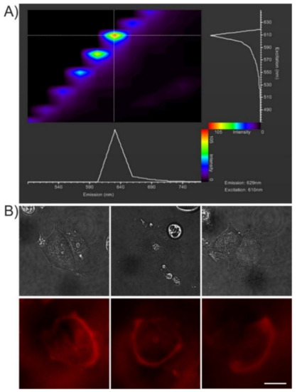 The membrane-labelling property of the CQD@Arg particles and their fluorescence emission in the far-red region of the visible spectrum makes them an attractive candidate for applications in bioimaging. However, their adhesion to glass produces a strong fluorescent background that precludes visibility of the cellular structures at the ventral cell surface. It has been proposed that the red fluorescence of arginine-derived fluorescent CQDs can arise as a consequence of the re-absorption of primary blue fluorescence under high-density conditions, a phenomenon known as the inner filter effect [54,55]. Alternatively, the red-shifted excitation and emission spectra of CQD@Arg might result from delocalization of the excited states and collective excitations, i.e., excitons, which appear in the condensed state of the nanosized particles in the surface layers [56].