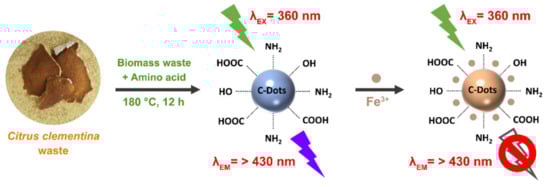 The waste produced during processing in the food industry has become a burgeoning problem, making the proper waste management and its utilization of great importance for the environment and public health [5]. Citrus fruits are highly produced and consumed worldwide, and it has been reported that 110–120 million tons of citrus waste is generated every year by the food processing industry [6]. The most recent studies have shown that waste biomass disposal can develop high-value products used in the food, pharmaceutical, and cosmetic industry, and for medical purposes. The extraction and purification of bioactive and health-beneficial compounds derived from the waste biomass have been extensively studied. It is well known that natural biomass can be converted into valuable products usable in a wide variety of applications [7]. Plant-based biomass mainly comprises of carbohydrates, proteins, lipids, minerals, and phenolic compounds, and therefore it could represent an excellent carbon source for CQDs fabrication.