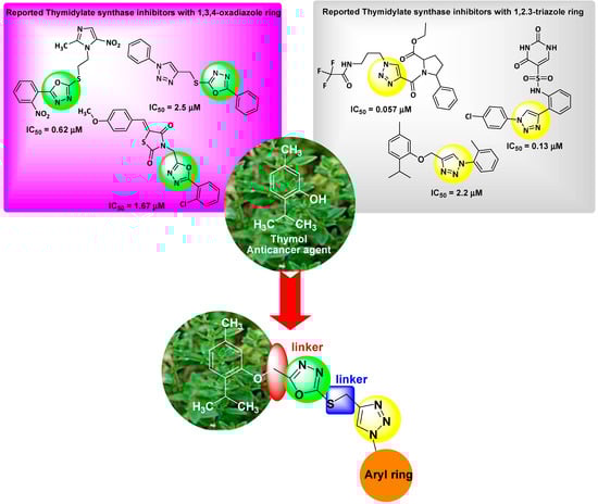 Thymidylate synthase inhibitors are evolving as a captivating target in chemotherapy [21]. These inhibitors induce apoptosis and cause cell cycle arrests by halting deoxythymidine monophosphate, which is responsible for formation of dTTP (a DNA synthesis precursor) [22]. From the literature, it is reported that 1,3,4-oxadiazole and 1,2,3-triazole derivatives exhibit antiproliferative activity by inhibiting thymidylate synthase [23,24,25,26,27,28] (Figure 1). Our research group has been involved in the development of anticancer leads targeting thymidylate synthase. In continuation of our previously reported work [20,23,26,29], we aim to incorporate both these heterocycles with thymol in a single molecule to generate new anticancer leads. Therefore, we report the synthesis of thymol-incorporated 1,3,4-oxadiazole and 1,2,3-triazole hybrids, anticancer and antimicrobial activities, as well as computational studies.