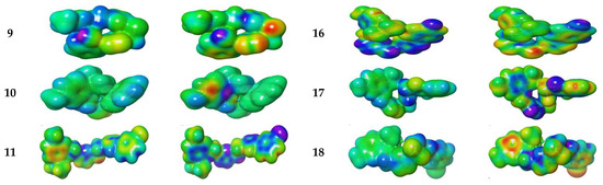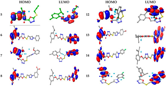 To understand the structural elements of thymol conjugates, frontier molecular orbitals energy are shown in Figure 2. The HOMO/LUMOs and HOMO–1/ LUMO+1 of thymol derivatives were probed at B3LYP/6-311+G(d,p) using the LANL2DZ level [32]. HOMO was observed over the thymol corner for compounds 5–18, whereas the LUMO zone was compressed opposite phenyl corners for 5–15 and18 but in compounds 16 and 17, LUMO overlapped bis-triazole rings. This arrangement revealed that hybrids 5–17 possess intra-molecular charge transfer (ICT) between HOMOs to LUMOs. Compounds 5–18 correlated to the spatial distribution of molecular orbitals, enlightening the most credible locations which are mostly attacked by drugs. The energies of FMOs, for instance HOMO (EHOMO), LUMO (ELUMO), as well as energy gaps (ΔEHOMO/LUMO) between HOMO-LUMO and HOMO-1/LUMO+1 (ΔEHOMO/LUMO+1), are noteworthy parameters to probe molecules (Table 5).