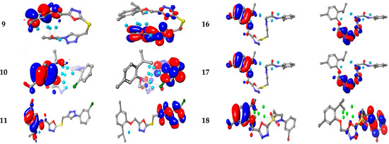 The ALIE (average local ionization energy map) was used to predict favorable molecular sites for electrophiles. The red color surrounds the thymol ring in all 6–18 (Figure 3). The electron density in the yellow color spreads over all 6–18 molecular backbones. The blue color is more localized in the oxadiazole linker. Thereby, these groups are prone to nucleophilic attacks.