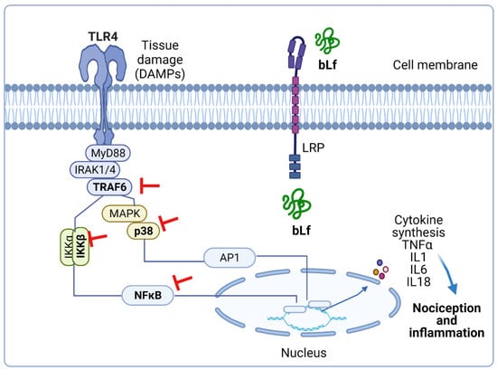 Presumable effect of bovine lactoferrin (bLf) on the damage-associated molecular pattern (DAMP)–Toll-like receptor 4 (TLR4)–TRAF6–nuclear factor κB (NFκB) signaling pathway. Tissue damage leads to host-derived endogenous DAMPs. The latter activate MyD88-dependent pathway via TLR4 signaling, thus initiating the transcription of cytokines that produce nociception and inflammation. Pre-treatment with bLf prevents inflammation by avoiding the activation of TRAF6, IKK, p38, and p65. This figure was created with Biorender.com (accessed on 25 August 2021).