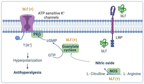 Presumable anti-hyperalgesic activity of bovine lactoferrin (bLf) through the nitric oxide (NO)–cyclic guanine monophosphate (cGMP)–ATP-sensitive K+ channel signaling pathway. NO has an anti-nociceptive effect based on the formation of cGMP via guanylate cyclase activation. Production of cGMP leads to cGMP-dependent protein kinase (PKG) phosphorylation and the concomitant opening of ATP-sensitive K+ channels. Activation of ATP-sensitive K+ channels increases the intracellular K+ levels that, in turn, drive hyperpolarization of the neuron, and therefore relieves nociception and reestablishes the basal threshold of the neuron. bLf may exert its anti-hyperalgesic effect by activating the NO–cGMP–ATP- sensitive K+ channel signaling pathway. This figure was created with Biorender.com.