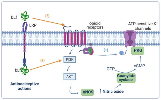 Previous evidence has demonstrated that peripheral opioid agonist-induced anti-nociception is mediated by the NO–cGMP pathway [92,93]. In this context, bLf-induced peripheral anti-nociception was reverted by a NOS inhibitor, and a subeffective dose of bLf potentiated the morphine-induced anti-nociceptive effect, which was also reverted by a NOS inhibitor [62]. On the other hand, a subeffective dose of bLf (1.025 nmol/h, i.t.) potentiated the µ opioid agonist (morphine, 27 nmol/h, i.t.)-induced anti-nociceptive effect in the tail-flick test [59]. Moreover, spinal injection of bLf increased the µ opioid receptor system through NO production and induced anti-nociception without tolerance [59]. These data suggest that bLf acts as an enhancer of the spinal opioidergic system via an NO-mediated mechanism. Interestingly, Cunha et al. [94] described that the activation of the NO pathway by morphine depended on an initial stimulation of the phosphoinositide 3-kinase (PI3K)–AKT signaling pathway, which in turn might cause the stimulation of nNOS to enhance NO production. Consequently, NO, through the stimulation of cGMP/PKG, causes the upregulation of K+ currents of ATP-sensitive K+ channels and promotes the hyperpolarization of primary nociceptive neurons [94]. Hence, a subeffective dose of bLf (300 mg/kg, p.o.) induced potentiation of morphine-induced anti-nociception [95]. Moreover, the intraperitoneal administration of 7-NI blocked the potentiated anti-nociceptive effect by coadministration of morphine and bLf [95]. Furthermore, Hayashida et al. [62] reported that the peripheral administration of bLf also potentiated the morphine-induced anti-nociceptive action. There has been no evidence that Lf can activate the PI3K–AKT signaling pathway in animal models of pain. In vitro studies have suggested that Lf downregulates thromboxane 2 (TXA2) and upregulates prostacyclin 2 (PGI2) through activating the PI3K–AKT–ERK1/2 signaling pathway in human umbilical vein endothelial cells [96]. Moreover, Lf induced the activation of AKT in human breast adenocarcinoma (MCF) cells; however, the treatment of MCF cells with a PI3K inhibitor almost completely blocked Lf-stimulated cell cycle progression [97]. Taken together, these data suggest that this peripheral potentiation of anti-nociceptive activity of bLf with morphine involves the NO and PI3K–AKT signaling pathways (Figure 3). However, further investigation in the future is necessary to clarify this point.