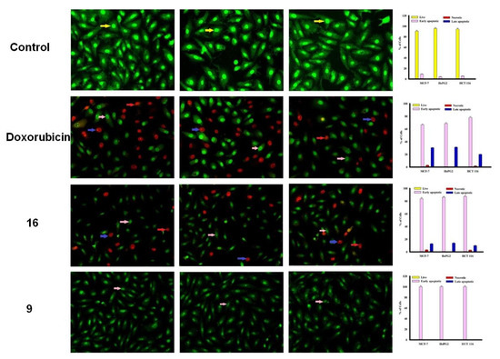 In addition, compound 16 induces a high percentage of necrosis towards MCF-7 and HePG2 cells as well as compound 15 with HCT 116 cells, while compound 9 does not cause death of the necrosis pathway in all cancer cells (Figure 3). Late apoptosis was observed at a high rate after treatment with compound 16 on MCF-7 and HePG2 cells and compound 15 induces more late apoptosis in HCT 116 cells compared to other cancer cells.