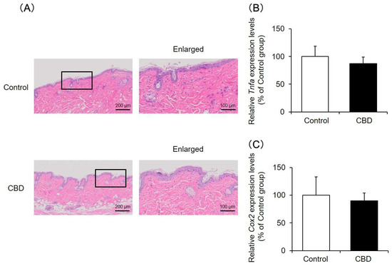 Skin tissue was analyzed after the application of CBD for 14 days by hematoxylin and eosin (HE) staining. The results showed that, even when CBD was applied, the skin tissue was similar to that in the control group, and no obvious skin tissue disorders were observed (Figure 1A). In addition, the mRNA expression levels of Tnfa and Cox2, which are increased during inflammation, were not altered by the application of CBD (Figure 1B,C).