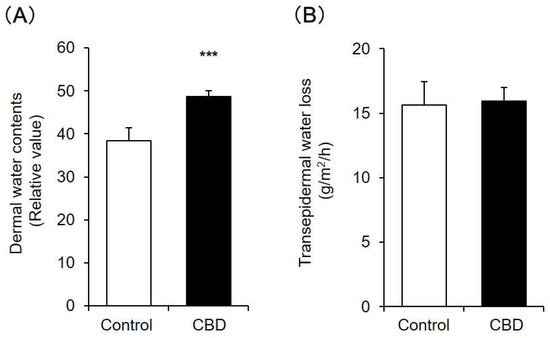 Dermal water content and TEWL after CBD was applied for 14 days were measured. The dermal water content in the CBD-treated group was significantly increased compared to that in the control group (Figure 2A). In contrast, TEWL in the CBD-treated group was similar to that in the control group (Figure 2B).