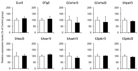 Expression levels of skin moisturizing factor-related genes. A 1% CBD solution was applied to the back skin of mice for 14 days (black). A solvent was applied to the control group (white). After the treatment, the mRNA expression levels of Lor, Flg, Col1a1, Col1a2, Hyal1, Has2, Acer1, Asah1, Sptlc1, and Sptlc2 in the skin were analyzed by real-time RT-PCR (n = 6, means ± SD).