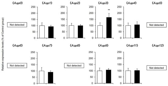 Aqp mRNA expression levels in the skin. A 1% CBD solution was applied to the back skin of mice for 14 days (black). A solvent was applied to the control group (white). After the treatment, the mRNA expression levels of Aqp in the skin were analyzed by real-time RT-PCR (n = 6, means ± SD, ** p < 0.01 vs. the control group).