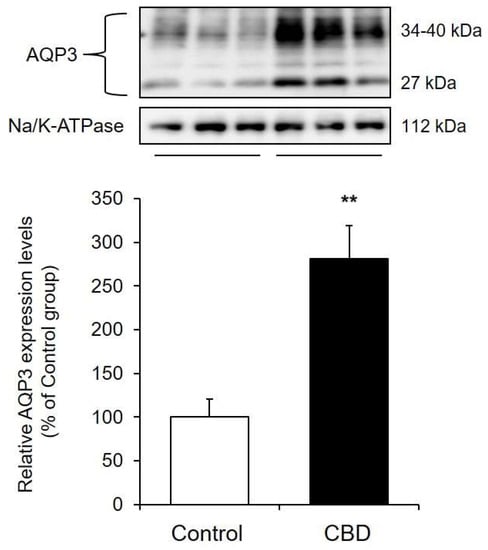 When the protein expression level of AQP3 was analyzed by Western blotting, two bands were detected. The band at approximately 27 kDa was nonglycosylated, and the band at approximately 30–40 kDa was glycosylated. Since there was no difference in water permeability between nonglycosylated AQP and glycosylated AQP [23,24,25], the total of these band densities was used for analysis in this study. The protein expression level of AQP3 after CBD treatment was significantly higher than that in the control group (Figure 5).