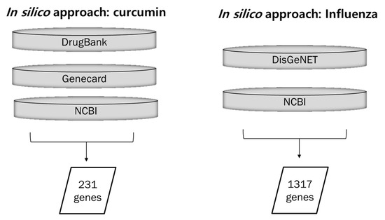 Collection of data for curcumin-, influenza-, and lung inflammation-associated genes. Curcumin-associated genes were collected from three databases: DrugBank, GeneCards, and NCBI. Influenza- and lung inflammation-associated genes were retrieved from two databases: DisGeNET and NCBI.
