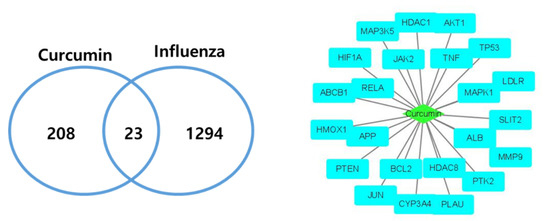 Overall, 231 H. sapiens target genes associated with curcumin were retrieved from DrugBank, GeneCards, and NCBI databases, and 1317 targets associated with influenza virus were identified from DisGeNET and NCBI databases (Figure 1).