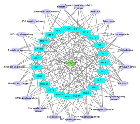Curcumin–disease target and disease target–pathway networks were constructed and visualized using Cytoscape [37]. Pathways with p-values < 0.05 were used in this network. The two constructed networks were analyzed and merged to produce a compound–disease target–pathway (C-D-P) network.