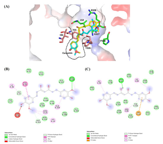 The proposed ligand–receptor interactions of curcumin–AKT1 from molecular docking: (A) ligand–receptor interactions of the keto (cyan) and enol (yellow) forms of curcumin with AKT1 showing the electrostatic surface in the 3D representation. Half of the curcumin is tightly bound in AKT1 with the hydrophobic residues (pink) of Ile36, Phe55, and Y326, and the other half is partially exposed to solvent and interacts with the surface residues (green) of Leu52, Gly327, Arg328, and Pro388. The tight hydrophobic pocket is shown in the dashed black line; (B) the detailed molecular interactions of the keto form of curcumin with AKT1 in the 2D representation; (C) the detailed molecular interactions of the enol form of curcumin with AKT1 in the 2D representation.