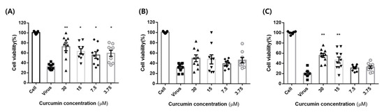 Curcumin cytopathic effect (CPE) test. MDCK cells were treated with influenza virus (100TCID50) with or without different concentrations of curcumin (3.125–30 µM): (A) pre-treatment: MDCK cells were pre-treated with different concentrations of curcumin for 1 h at 37 °C and then infected with influenza virus for 48 h to determine curcumin’s prophylactic effect; (B) co-treatment: MDCK cells infected with virus were co-treated with different concentrations of curcumin for 48 h at 37 °C to determine curcumin’s virus binding-inhibitory effect; (C) post-treatment: MDCK cells were infected with virus for 1 h and then incubated with curcumin for 48 h at 37 °C to validate whether curcumin exhibits therapeutic effects. ** p < 0.001, * p < 0.05, compared with the virus group; NS, not significant.