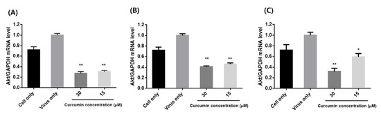 Effects of curcumin treatment on mRNA expression of AKT in influenza-infected MDCK cells: (A) pre-treatment: MDCK cells were pre-treated with different concentrations (15 and 30 µM) of curcumin and infected with influenza virus; (B) co-treatment: MDCK cells infected with virus were co-treated with different concentrations of curcumin; (C) post-treatment: MDCK cells were infected with virus and then incubated with curcumin. ** p < 0.001, * p < 0.05, compared with the virus group.