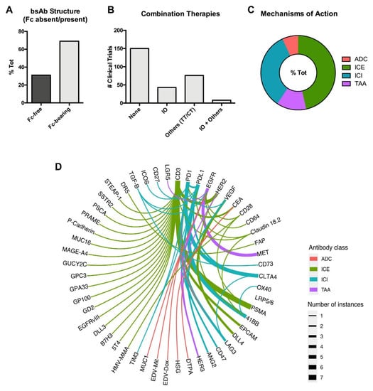 Although many bsAbs showed remarkable activity especially in the context of B-ALL [24], most clinical trials so far have been conducted in patients with solid malignancies, as recapitulated in Tables S1 and S2 [16]. In this setting, most trials investigated Fc-bearing bsAbs (69%) either alone (approximately 50%) or in combination with immunotherapies or other agents (i.e., target therapies or chemotherapies) (Figure 2A,B). Interestingly, most clinical trials conducted in solid tumors involve bsAbs with ICE or ICI functions (Figure 2C,D). In this section we will discuss the most promising compounds that have thus far yielded preliminary safety and, eventually, clinical results, further summarized in Figure 3.