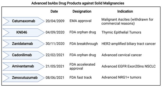 Advanced bsAbs Drug Products against Solid Malignancies. The figure depicts bsAbs receiving regulatory designations for their use in solid malignancies. Designations included, approval, accelerated approval, fast track, breakthrough, orphan drug. EMA, European Medical Agency; FDA, Food and Drug Administration; HER2, human epidermal growth factor; EGFR, Epidermal Growth Factor Receptor; NSCLC, Non-Small Cell Lung Cancer; NRG1, Neuregulin 1. Created with BioRender.com.