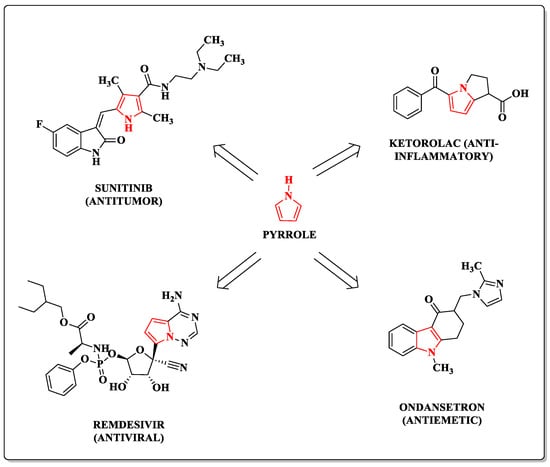 The pyrrole ring (Figure 1) is a five-membered aromatic heterocycle with electron-rich characteristics. It comprises four carbon atoms and was isolated and characterized for the first time in 1857 [12,13]. The pyrrole moiety is obtained through various synthetic methods widely discussed in the literature [14], besides being found extensively in natural products [11]. This heterocycle is commonly found in molecules with several biological activities, for example, in drugs approved by the Food and Drug Administration (FDA), such as the anticancer drug sunitinib (Figure 1). It is also possible to find this nucleus fused with other cycles in antiemetic, anti-inflammatory, and antiviral agents such as remdesivir (Figure 1) [10,14].