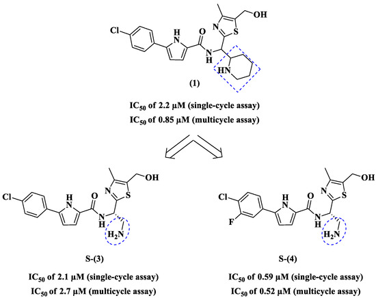Further optimization of the ADMET properties of lead compound 7 was approached by replacing the phenyl ring in the region I with a pyridine ring (Figure 6) [41], according to the benefits mentioned in the literature [42,43,46]. The best result was observed for NBD-14270 (8) (Figure 6). Compared with analog 7, this new compound showed an increased IC50 by approximately two-fold and an improved CC50 by approximately five-fold, leading to a SI of 683 (Table 1).