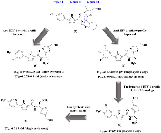 Structural modifications of compound 1 that led to analogs 5–8 and their anti-HIV-1 profiles [39,40,41].