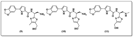 Chemical structures of the three best compounds synthesized by Curreli et al. [47]: 9, 10, and 11.