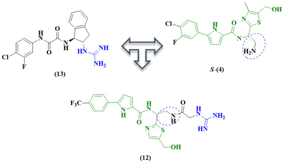 The results of the biological evaluation of derivative 12 showed improved antiviral activity compared to molecule 13 (compound 13, IC50 21.3 μM; compound 12, IC 50 10.8 μM) in a single-cycle infection assay (TZM-bl cells/HIV-1HXB-2), but this improved activity was not observed when compared with standard NBD analog 4 (IC50 0.59 μM) [49] (Table 1). However, guanidine analog 12 showed an excellent cytotoxicity profile (CC50 of 145.9 μM) compared with control molecule 4 (CC50 of 40.5 μM) (Table 1) [48].