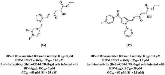 Pyrrolyl scaffold is a good starting point to obtain molecules with promising anti-IN or anti-IN/RNase H pharmacological profiles once it has a synthetic versatility [61]. In this context, two pyrrolyl derivatives, 16 and 17, were developed [9,57]. Compounds 16 and 17 showed dual activity with micromolar IC50 values against HIV-1 IN and RT RNase H. Notably, pyrrole 17 was a promising dual inhibitor, although it did not exhibit good potency in HIV-infected cells (16, EC50 2 μM; 17, EC50 20 μM) and both of them showed a CC50 > 50 μM (Figure 10). Comparing the selectivity pattern of the two compounds, 16 provides excellent and greater cell protection (SI > 25 μM) than 17 (SI > 2.5 μM).