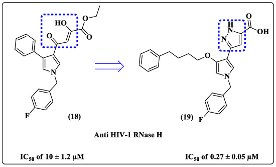 Intending to overcome the problems reported for diketo acid (DKA) [62] and improve selectivity for RNase H of HIV-1, Messore et al. [58] developed a library of compounds that mimicked the DKA moiety presented in dual inhibitor 18 (IC50 10 μM against HIV-1 RNase H) (Figure 11) through replacement with a pyrazole ring. In this series, derivative 19 (Figure 11) was the most potent compound, showing an IC50 of 0.27 μM against HIV-1 RNase H (Figure 11). Additionally, the goal of obtaining better selectivity for the RT domain versus IN was achieved, and the derivatives showed good serum stability compared to their corresponding DKA derivatives.