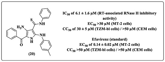 Among the pyrrole derivatives, molecule 20 showed the best RT-associated RNase H inhibitory activity, with an IC50 of 6.1 ± 1.6 μM. However, its EC50 value for HIV-1 inhibition activity in the cell-based assay was >30 μM (Figure 12), demonstrating its lack of ability to inhibit HIV-1 replication. In addition, all tested pyrrole derivatives were cytotoxic (Figure 12). Due to its inability to maintain cell viability, the RT-associated RDDP inhibitory activity of these pyrrole derivative was not verified. Only the most active compound, which belonged to the 1H-pyrazole-4-carbothioamide derivative series, was evaluated by the authors for its inhibitory potential of RT-associated RDDP [73].