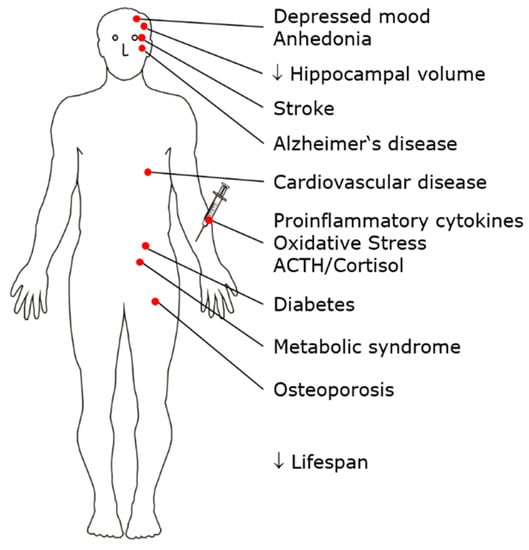 MDD is a common mental disorder with a lifetime prevalence of approximately 10%. Patients suffer a high overall burden of disease due to severe impairment during each episode of illness, long individual episodes of illness, an often early age of onset, and an often recurrent course [14]. MDD is a risk factor for the development of cardiovascular disease, diabetes, metabolic syndrome, osteoporosis, Alzheimer’s disease, and hippocampal atrophy. The adrenocortical stress axis is activated, and changes in serum lipids occur; peripheral proinflammatory cytokines, including interleukin-1β (IL-1β), markers of oxidative stress and inflammation, and serum phospholipase A2 activity are increased. Independent of suicide, life expectancy is reduced in patients with MDD. Therefore, MDD is considered not only a mental disorder but also a multisystem whole-body disease [15,16,17,18,19] (Figure 1).