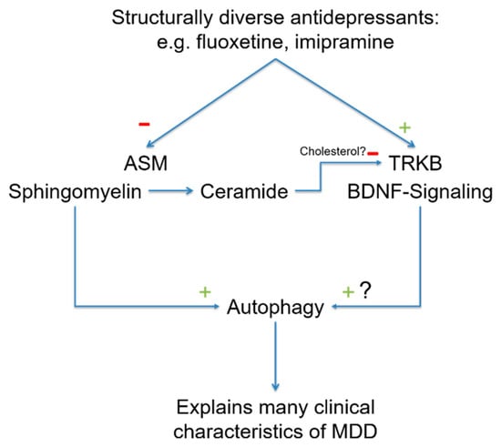 BDNF stimulates neuronal plasticity and induces antidepressant effects [136]. The receptor for BDNF is TRKB. Recently, it has been shown that antidepressants bind directly to TRKB and facilitate the binding of BDNF via allosteric modifications. This novel mechanism of action explains the effects of antidepressants on neuroplasticity [137]. This study demonstrated that antidepressants such as fluoxetine, ketamine and imipramine bind to a specific region in TRKB [137]. The binding of antidepressants to TRKB is facilitated by cholesterol. TRKB can sense cholesterol, which promotes TRKB dimerization. TRKB dimerization, in turn, promotes fluoxetine binding by forming a binding pocket for fluoxetine. The binding of antidepressants ultimately stabilizes the active conformation of TRKB and facilitates signaling via TRKB. The study also demonstrated that a point mutation in TRKB abrogates the binding of antidepressants [137]. Notably, in membrane domains, ceramide displaces cholesterol [138], and a reduction in membrane ceramides through ASM inhibition might be a prerequisite of FIASMAs binding to TRKB to stabilize TRKB signaling. Furthermore, it might even be possible that the binding of antidepressants to TRKB involves sphingomyelin and thereby prolongs FIASMA activity. In this model, antidepressants might act on ASM to increase sphingomyelin, which promotes autophagy and the direct or indirect binding of antidepressants to TRKB. TRKB has also been linked to the regulation of autophagy [139], and it is possible that both pathways converge at the level of autophagy (Figure 2).