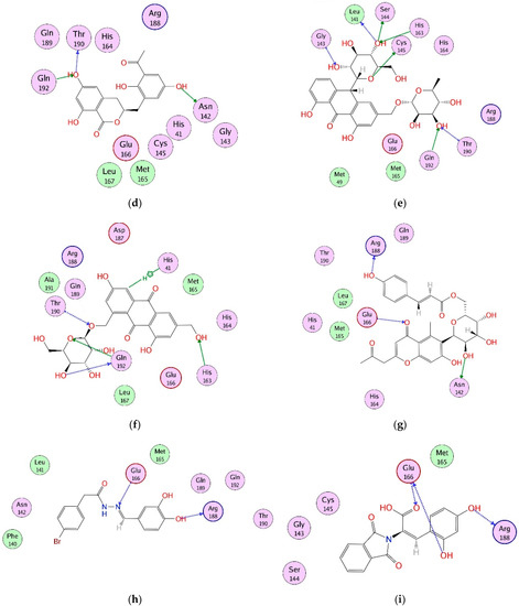 After sequence and structural alignment of eight Mpro structures (used in VS), the main pharmacophoric features required for optimal binding were deduced. We observed that His41, Phe140, Gly143, Cys145, His163, His164, Glu166, Gln189, and Thr190 play important roles in the stabilization of protein–ligand binding by providing hydrogen bonds or hydrophobic interactions. Thus, the interactions of the selected ligands with those important residues were scrutinized. The docked view of compound 1 (2-(3,4-dihydroxyphenyl)-3,5,7-trihydroxy-4H-chromen-4-one) showed that the compound binds at S1, S2 and S3 subsites, and its hydroxyl groups and the carbonyl moiety formed H-bonds with multiple important residues including Phe140 of S1, Cys145 of S1 and S2, His163 of S1, and His164 of S3. Similarly, the substituted -OH moieties of compound 2 (1R,2R,3S,4S,6S)-6-((E)-3-(3,4-dihydroxyphenyl) acryloyloxy)-2,3,4-trihydroxycyclohexyl 3,4,5-trihydroxybenzoate) formed multiple H-bonds with the side chains of Cys145 (S1 and S2 subsites) and Met165 of S3, and with the main chain carbonyl oxygen of Glu166. Moreover, Glu166 formed bidentate interactions with the -OH group and dihydropyranone oxygen of compound 3 (2-(2,4-dihydroxyphenyl)-5,7-dihydroxy-3-((2R,3S,4S,5R,6R)-4,5,6-trihydroxy-2-(hydroxy methyl)-tetrahydro-2H-pyran-3-yloxy)-4H-chromen-4-one), whereas one of the -OH groups of compound 3 mediated H-bonds with Leu141, while the substituted pyran -OH groups of compound 4 (1,3,8-trihydroxy-6-(((2R,3R,4R,5R,6R)-3,4,5-trihydroxy-6-methyl-tetrahydro-2H-pyran-2-yloxy) methyl) anthracene-9,10-dione) interacted with Glu166 and Gln192. Similarly, the -OH and the carbonyl oxygen of compound 5 (2-(2,4-dihydroxyphenyl)-5,7-dihydroxy-3-methyl-4H-chromen-4-one) mediated H-bonding with Leu141 and Cys145, respectively. However, the substituted -OH groups of compound 6 ((S)-3-(3-acetyl-2,5-dihydroxybenzyl)-6,8-dihydroxy-3,4-dihydroisochromen-1-one) formed H-bonds with Asn142, Thr190, and Gln192. Similarly, Thr190 and Glu166 mediated H-bonds with the -OH groups of compound 7 (1,6-dihydroxy-3-methyl-8-((2R,3R,4R,5R,6R)-3,4,5-trihydroxy-6-(hydroxymethyl)-tetrahydro-2H-pyran-2-yloxy) anthracene-9,10-dione). Interestingly, compound 8 ((S)-4,5-dihydroxy-9-((2R,3R,4R,5S,6R)-3,4,5-trihydroxy-6-(hydroxymethyl)-tetrahydro-2H-pyran-2-yl)-2-(((2R,3R,4R,5R,6S)-3,4,5-trihydroxy-6-methyl-tetrahydro-2H-pyran-2-yloxy) methyl) anthracen-10(9H)-one) mediated the highest number of H-bonds with the side chains and backbone atoms of Gly143, Leu141, Ser144, His163, Cys145, Thr190, and Gln192. Therefore, this molecule was considered to be the most promising inhibitor. Moreover, compound 9 (1,3,8-trihydroxy-6-(((1R,2R,3R,4S,5S)-2,3,4-trihydroxy-5-methylcyclohexyloxy) methyl) anthracene-9,10-dione) formed multiple interactions with Ser144, Thr190, and Gln192. Like compound 8, compound 10 (1,6-dihydroxy-3-(hydroxymethyl)-8-(2R,3R,4R,5R,6R)-3,4,5-trihydroxy-6-(hydroxymethyl)-tetrahydro-2H-pyran-2-yloxy) methyl) anthracene-9,10-dione) also mediated several interactions with key residues including His163, Thr190, and Gln192, whereas His41 provided H–π interaction to the compound. Similarly, compound 11 ((E)-((2R,3R,4R,5R,6R)-3,4,5-trihydroxy-6-(7-hydroxy-5-methyl-4-oxo-2-(2-oxopropyl)-4H-chromen-6-yl)-tetrahydro-2H-pyran-2-yl) methyl 3-(4-hydroxyphenyl) acrylate) displayed H-bonding with Asn142, Glu166, and Arg188. The compounds 12 ((E)-N′-(3,4-dihydroxybenzylidene)-2-phenylacetohydrazide) and 13 ((E)-3-(2,4-dihydroxyphenyl)-2-(1,3-dioxoisoindolin-2-yl) acrylic acid) formed H-bonds with Glu166 and Arg188, while compounds 14 ((2R,3S)-2-(3,4-dihydroxyphenyl)-3,4-dihydro-2H-chromene-3,5,7-triol) and 16 (4,11-dibutyl 5,10-bis(2-hydroxyphenyl)-3,12-dithiatricyclo[7 .3.0.02,6]dodeca-1,4,6,8,10-pentaene-4,11-dicarboxylate) interacted with Glu166 and Ser144, and Gly143 and Ser144, respectively. The binding mode of compound 15 ((E)-((2R,3R,5R,6R)-3,4,5-trihydroxy-6-(7-methoxy-5-methyl-4-oxo-2-(2-oxopropyl)-4H-chromen-6-yl)-tetrahydro-2H-pyran-2-yl) methyl 3-(4-hydroxyphenyl) acrylate) demonstrated that Gln192, Thr190, and His163 stabilized the compound in the active site of Mpro through multiple H-bonds, while Thr190 and Gln192, and residues Glu166 and Gln192, provided H-bonds to the compounds 17 (3,5-dihydroxy-2-(4-hydroxy-3-methoxyphenyl)-7-methoxy-4H-chromen-4-one) and 18 ((E)-2-(1,3-dioxoisoindolin-2-yl)-3-(4-hydroxyphenyl) acrylic acid), respectively. Compound 19 ((R)-3-((R)-6-(2,2-bis(4-fluorophenyl)ethyl)-4-methoxy-5,6,7,8-tetrahydro-[1,3]dioxolo[4,5-g]isoquinolin-5-yl)-6,7-dimethoxyisobenzofuran-1(3H)-one) formed a H-bond with the main chain nitrogen of Glu166, while the amino nitrogen and -OH group of Ser144 and main chain nitrogen of Cys145 stabilized compound 20 (3-{4-[2-carboxy-2-(1,3-dioxo-2,3-dihydro-1H-isoindol-2-yl)eth-1-en-1-yl]phenyl}-2-(1,3-dioxo-2,3-dihydro-1H-isoindol-2-yl)prop-2-enoic acid) through H-bonding, whereas compounds 21 ((E)-((2R,3R,5R,6R)-3,4,5-trihydroxy-6-(7-hydroxy-5-methyl-4-oxo-2-(2-oxopropyl)-4H-chromen-8-yl)-tetrahydro-2H-pyran-2-yl)methyl 3-(4-hydroxyphenyl)acrylate), 22 ((R)-2-((R)-5-((R)-4,5-dimethoxy-1,3-dihydroisobenzofuran-1-yl)-4-methoxy-7,8-dihydro-[1,3]dioxolo[4,5-g]isoquinolin-6(5H)-yl)-2-(9H-fluoren-3-yl)ethanamine), 23 ((R)-{6-[2,2-bis(4-fluorophenyl)ethyl]-4-methoxy-2H,5H,6H,7H,8H-[1,3]dioxolo[4,5-g]isoquinolin-5-yl}[2-(hydroxymethyl)-3,4-dimethoxyphenyl]methanol) and 24 ((S)-6-((1-(4-bromobenzyl)-1H-1,2,3-triazol-4-yl)methyl)-4-methoxy-5-((R)-5-methoxy-4-methyl-1,3-dihydroisobenzofuran-1-yl)-5,6,7,8-tetrahydro-[1,3]dioxolo[4,5-g]isoquinoline) formed a single H-bond with Cys145, His164, and Glu166, respectively. Moreover, compounds 25 (8-benzyl-N-cyclohexyl-14-methyl-7-oxo-5-phenyl-2,3,4,8,18-pentaazatetracyclo [8.8.0.02,6.012,17] octadeca-1(10),3,5,11,13,15,17-heptaene-9-carboxamide) and 26 ((9R,13R)-4-bromo-N9-{[(2R)-oxolan-2-yl]methyl}-14-phenyl-8-oxa-14,15,17-triazatetracyclo [8.7.0.02,7.012,16] h
