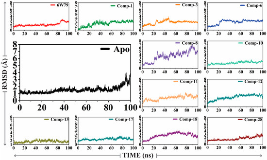 The X-ray structure of Mpro (PDB code: 6W79, reported by Mesecar et al. [47]) in complex with the broad-spectrum non-covalent inhibitor (X77) was selected for MD simulation as a positive control. The dynamic behavior and structural stability of Mpro in the apo form and inhibited states were analyzed through molecular dynamic simulation. The stability of all the complexes was analyzed by calculating the RMSD (alpha carbon, Cα) of all the complexes from the output generated trajectories after 100 ns. The apo–Mpro (Figure 2) was stable during the simulation except for the fraction between 96 and 100 ns. The apo–Mpro showed an acceptable range of fluctuation and gained stability till 100 ns (showed a smooth and straight graph). This behavior indicates that the free state of the protein was stable. However, the reference complex, Mpro–X77, showed that the RMSD gains equilibrium after 80 ns and is increased up to 100 ns. On the other hand, compound 1 formed several key interactions with the protein, and therefore showed a considerable increase in the RMSD after 25 ns, which affected the overall stability of the complex. A drastic deviation in the RMSD was observed from 20–80 ns during the simulation, whereas the RMSD for the Mpro–compound 3 complex was found stable till 20 ns, excluding the substantial convergence at the 25–45 ns period where the RMSD of the complex increased significantly. Shortly after the increase in the RMSD, no convergence was seen. Similarly, the Mpro–compound 6 complex depicted a major stability drift between 20 and 60 ns, while the RMSD remained increased till 100ns. Interestingly, the Mpro–8 complex revealed a substantial convergence in the stability until the simulation time. At different levels, significant convergence was observed in the RMSD of the Mpro–8 complex. The Mpro–10 complex showed a small drift in the convergence at 80 ns; however, the system remained stable. The Mpro–11 complex showed drastic shifts in the stability at several intervals of 15–25, 30–60, and 65–85 ns, which significantly affected the stability of the complex. Moreover, the stability of the Mpro–12 complex was also affected due to a continuous increase in the RMSD after 40 ns. In contrast, the Mpro–13 complex mediated friction between 30 and 40 ns; however, it showed minimal effect on the system’s stability. Similarly, the RMSD of the Mpro–17 complex was stable up to 50 ns; however, it increased at 50–60 and 75–90 ns. We observed that the Mpro–8 complex depicted a rapid increase in the RMSD between 20 and 90 ns (and therefore destabilized the system); however, after a drastic increase, the RMSD was stabilized after 90 ns. The Mpro–28 complex remained relaxed until 55 ns; however, the RMSD was increased after 55 ns and remained elevated throughout the simulation. The sudden increase indicates the fluctuation in the stability of the complex. Altogether, the results indicate that Mpro–3, Mpro–8, Mpro–11, Mpro–18, and Mpro–28 complexes attained more variation as compared to the apo–Mpro, while Mpro–8, Mpro–11, and Mpro–28 complexes were found unstable till the end of simulation and reached a maximum RMSD of 7 Å, 4 Å, and 3.9 Å, respectively, as compared to apo–Mpro and Mpro–X77 complex. During the simulation, no destruction in the simulated complexes (both apo and ligand-bound forms) was observed, which confirms the significance of the simulation. The RMSD graphs of all the complexes are shown in Figure 2.